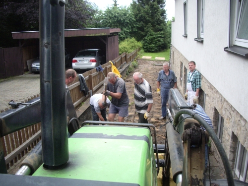 Am Mittwoch, den 11. Juli haben sich etliche Mitglieder der Männerturngruppe und der Nordic-Walking-Gruppe unter der Leitung von Andreas Seyer getroffen, um wie immer Sport zu treiben. Diesmal war es keine übliche Aufwärm- und Trainingsstunde und keine Walking-Runde durch LaPeKa, sondern ein schweißtreibendes Training mit 28 kg schweren Betonplatten. Sportkamerad Horst Melecky rief um Hilfe beim Entsorgen von alten Gehwegplatten auf seinem Grundstück. So wurden ca. 25 Tonnen Beton gestemmt und entsorgt. Ein herzliches Dankeschön für die Hilfe sagen Gabi und Horst Melecky