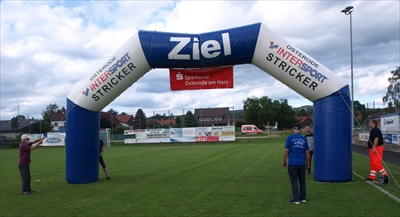 Manfred Stricker von Intersport Stricker hatte den Zielbogen gebracht, der mit vereinten Kräften vor dem Lauf aufgerichtet worden war.