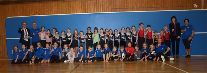 Zum Fototermin platzierten sich Angela Wauge und Jörg Stockhusen von der Sparkasse Osterode, Anja Biel, 1. Vorsitzende der TG, Vita Obermann, Sportwartin der TG, Jürgen Schaper, Schatzmeister der TG, Sportlehrer Werner Bohnen und gut vierzig Turnerinnen und Turner der TG vor der imposanten Matte.