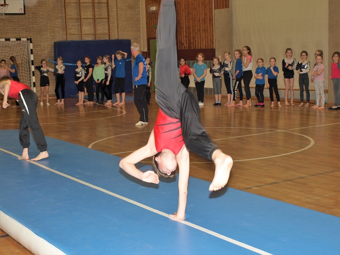 Außerdem macht es einen riesen Spaß wie ein Känguru über die Matte zu hüpfen. Zurzeit darf bei keiner Trainingseinheit die Matte fehlen. Weiterhin bereiten die Turnerinnen eine Vorführung auf der Airtrackmatte vor, die dann beim TG-Turnnachmittag am Sonntag, den 9. Dezember 2018, präsentiert werden kann. Das Trainerteam und die Kinder der TG bedankten sich mit einem süßen Präsent bei den beiden Vertretern der Sparkasse Osterode, die zu einem gemeinsamen Fototermin in die Halle kamen.