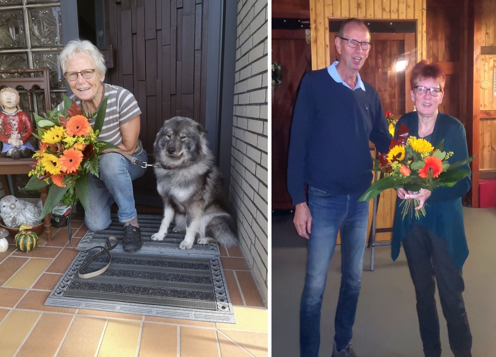 Schriftführer Volker Wilch brachte einen Tag darauf auch einen Blumenstrauß zu Rosel Schrader nach Hause. Sie war beim Übungsleiteressen verhindert. Dafür kam dann ihr junger Hund mit aufs Foto.