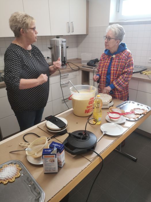 Ich rühre die zwei Eimer Waffelteig noch einmal mit der Bosch-Profi-Bohrmaschine und dem doppelt gewendelten neuen Profi-Mörtelrührer durch. Der Teig hat eine hervorragende Konsistenz. Ich könnte mich in den Eimer setzen, was mir meine Frau verbietet. Christina, Claudia und Birgit fangen mit dem Backen der Waffeln an.