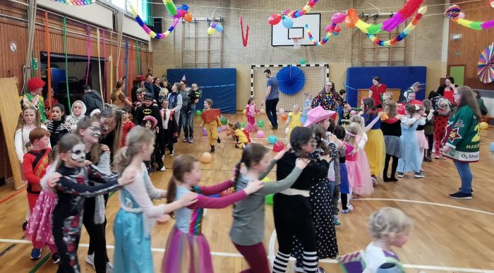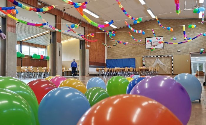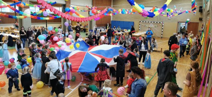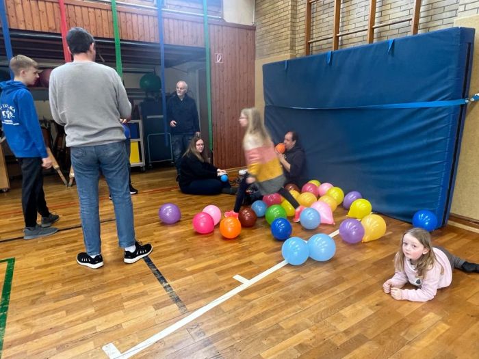 Der Höhepunkt war, als das Netz des Handballtores geöffnet wurde und eine Unmenge Luftballons sich in den Saal ergossen. Mit dem Schwungtuch wurden die Luftballons in die Luft geschleudert, während immer ein Teil der Kinder sich unter dem Schwungtuch verstecken musste.