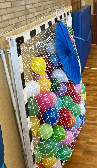 Eine Unmenge Luftballons wurde hinter dem Netz des Handballtores aufbewahrt, um - wie auf dem Traumschiff - einen Veranstaltungshöhepunkt zu unterstützen, nicht mit Torten und eklig stinkenden Wunderkerzen, sondern mit Ballons.
