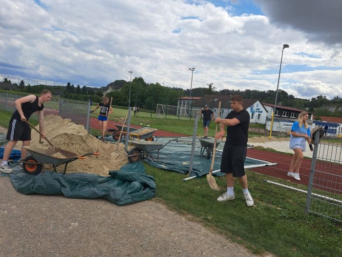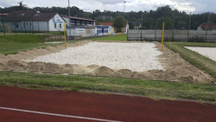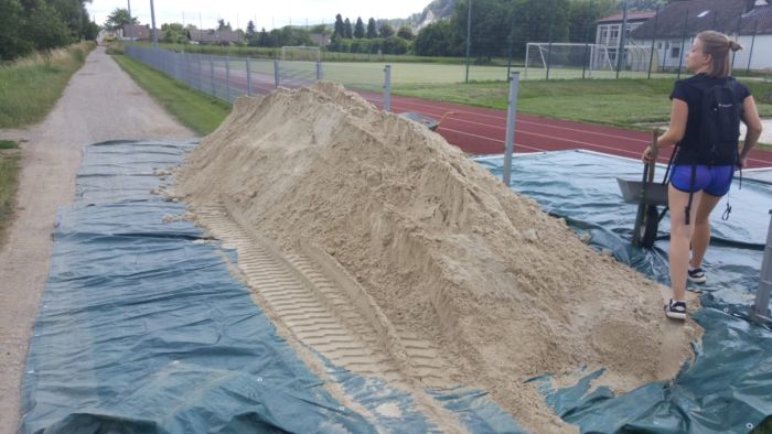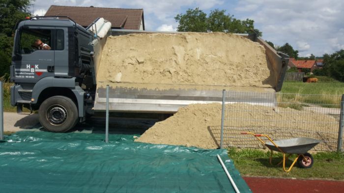 Zwischenzeitlich hatten wir das Kleingedruckte der LSB-Förderung gelesen: Instandsetzungs- und Sanierungsmaßnahmen bestehender Sportanlagen und Geräte sind von einer Förderung ausgeschlossen. Na gut, nach etlichen E-Mails hin und her war der Sand bestellt und der Liefertermin war für heute, Donnerstag, 13. Juli 2023, 14 Uhr avisiert.