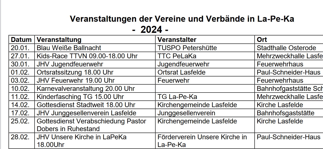 Am 16. Januar 2024 fand in der Bahnhofsgaststätte die Terminabsprache La-Pe-Ka für das Jahr 2024 statt. Hier geht es zum Download: Termine La-Pe-Ka 2024.