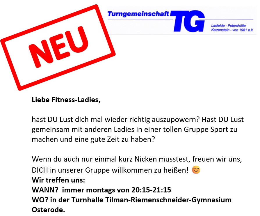 wir sind umgezogen! Wir trainieren ab sofort in der Turnhalle des Tilman-Riemenschneider-Gymnasiums. Hast DU Lust dich mal wieder richtig auszupowern? Hast DU Lust gemeinsam mit anderen Ladies in einer tollen Gruppe Sport zu machen und eine gute Zeit zu haben?